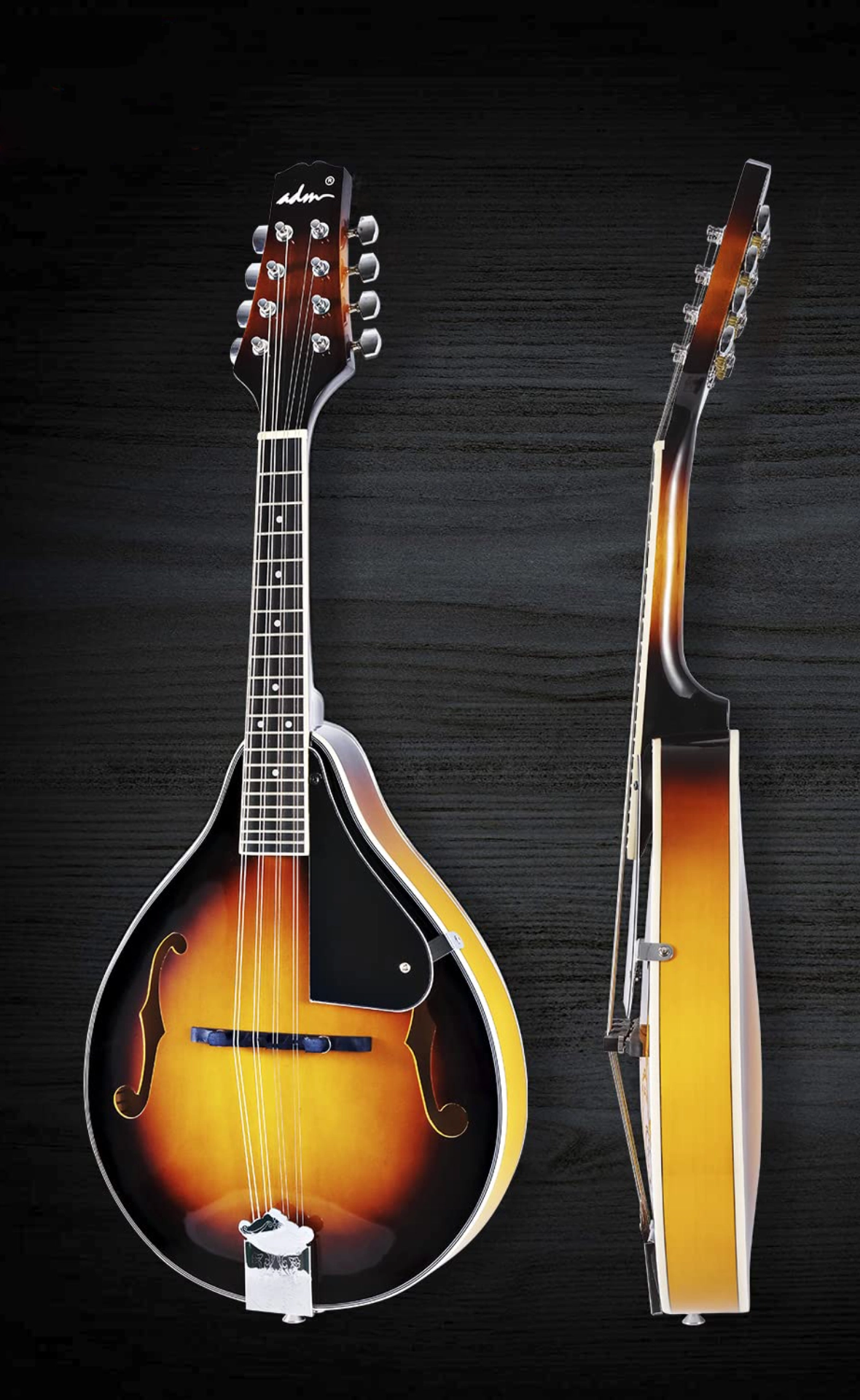 Beginner-friendly mandolin set for kids, students, and adults. Includes bag, tuner, pick-up, strap, strings, picks, and hanger in a classic sunburst finish.