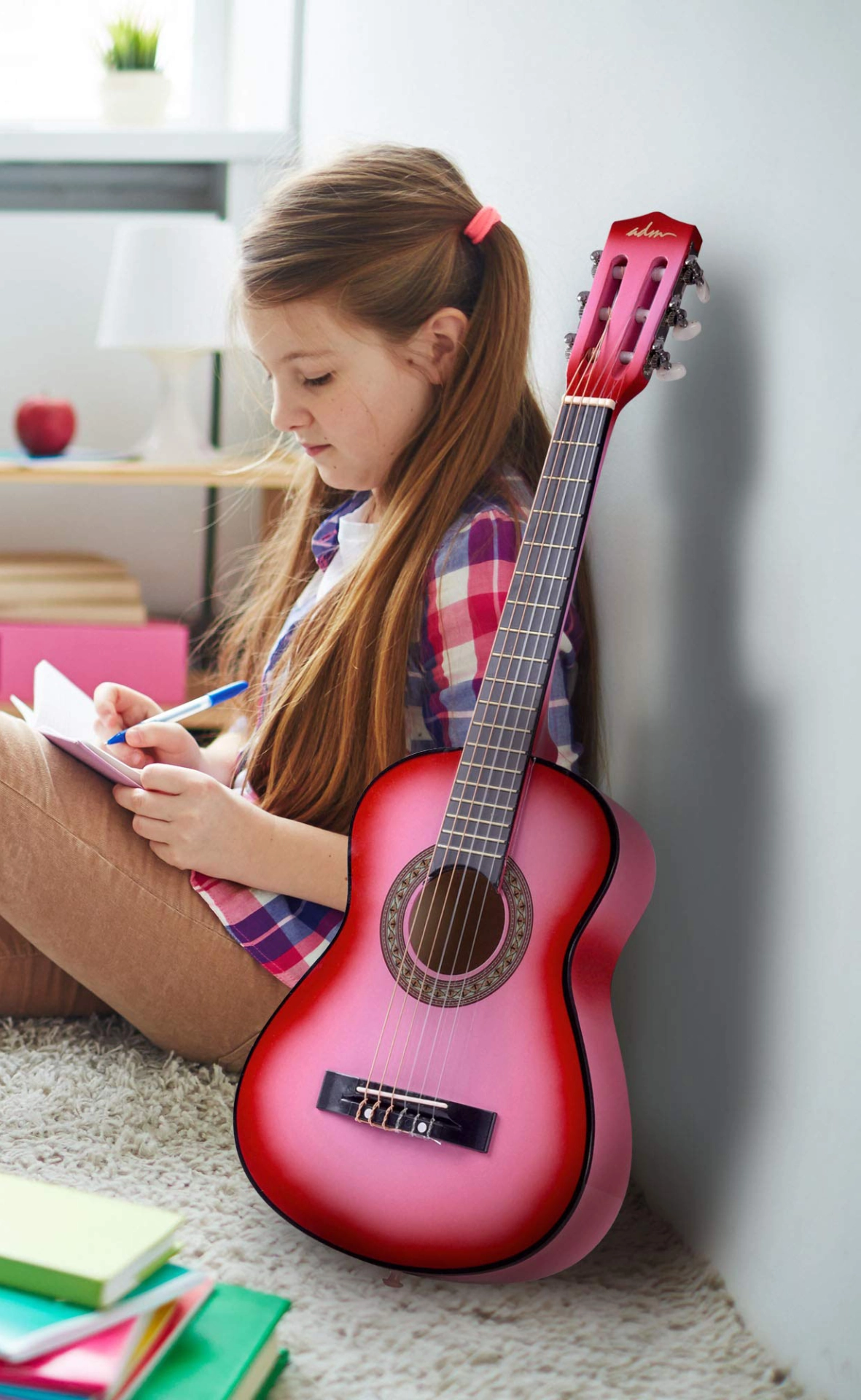 Bright pink nylon string guitar made for young beginners. Comes with gig bag, strap, tuner, spare strings, picks, and online lessons—perfect starter bundle.