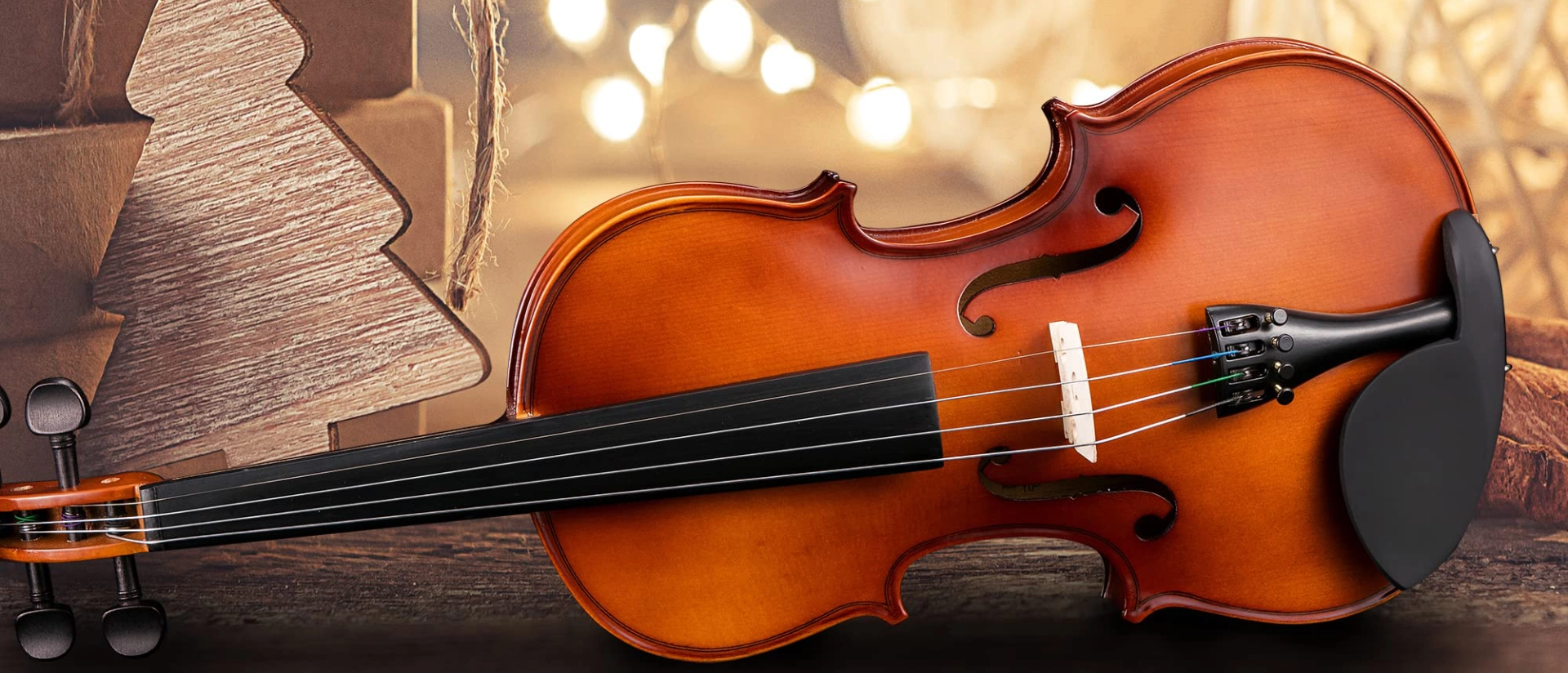 Solid wood violin with ebony fittings for kids, teens, and students. Complete set includes hard case, bow, rosin, shoulder rest, music stand, violin stand, and extra strings.