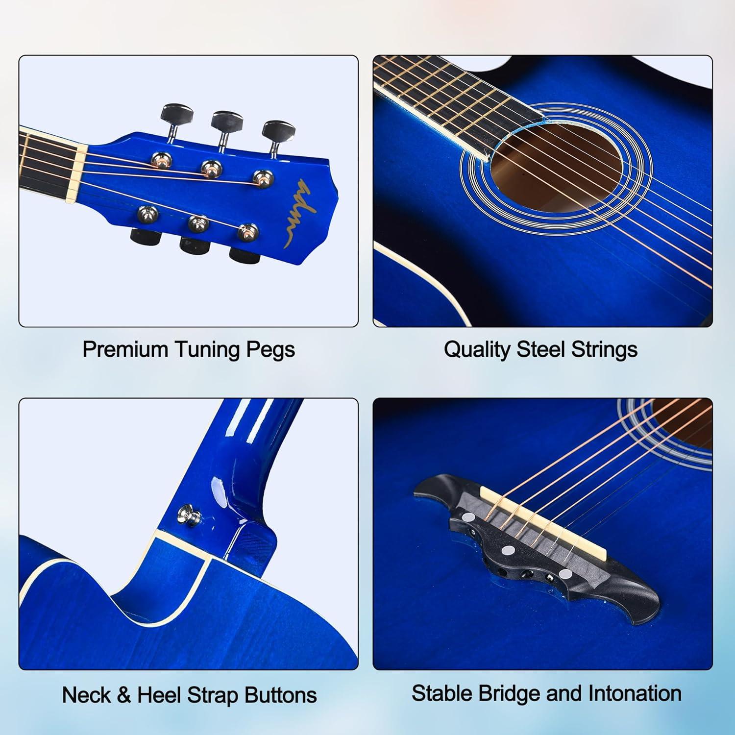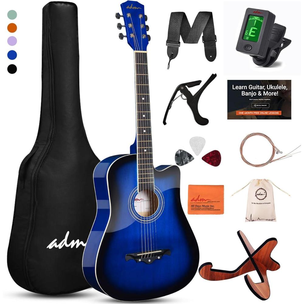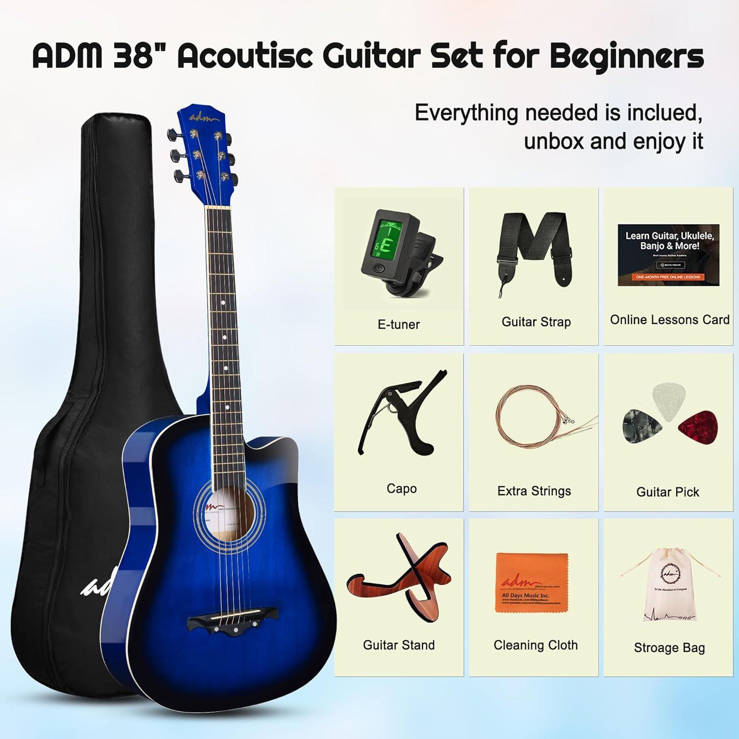 ADM 38″ Inch Acoustic Guitar Bundle for Beginners Adults with Online Lesson, Cutaway Wood Acustica Guitarra Starter Set Package with Gig Bag, Strap, Steel Strings, Picks, Capos, Stand, Green(Blueburst)