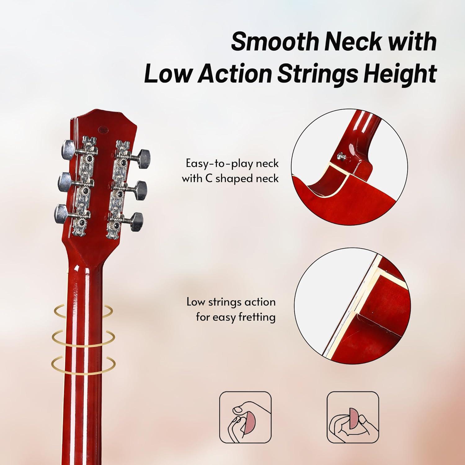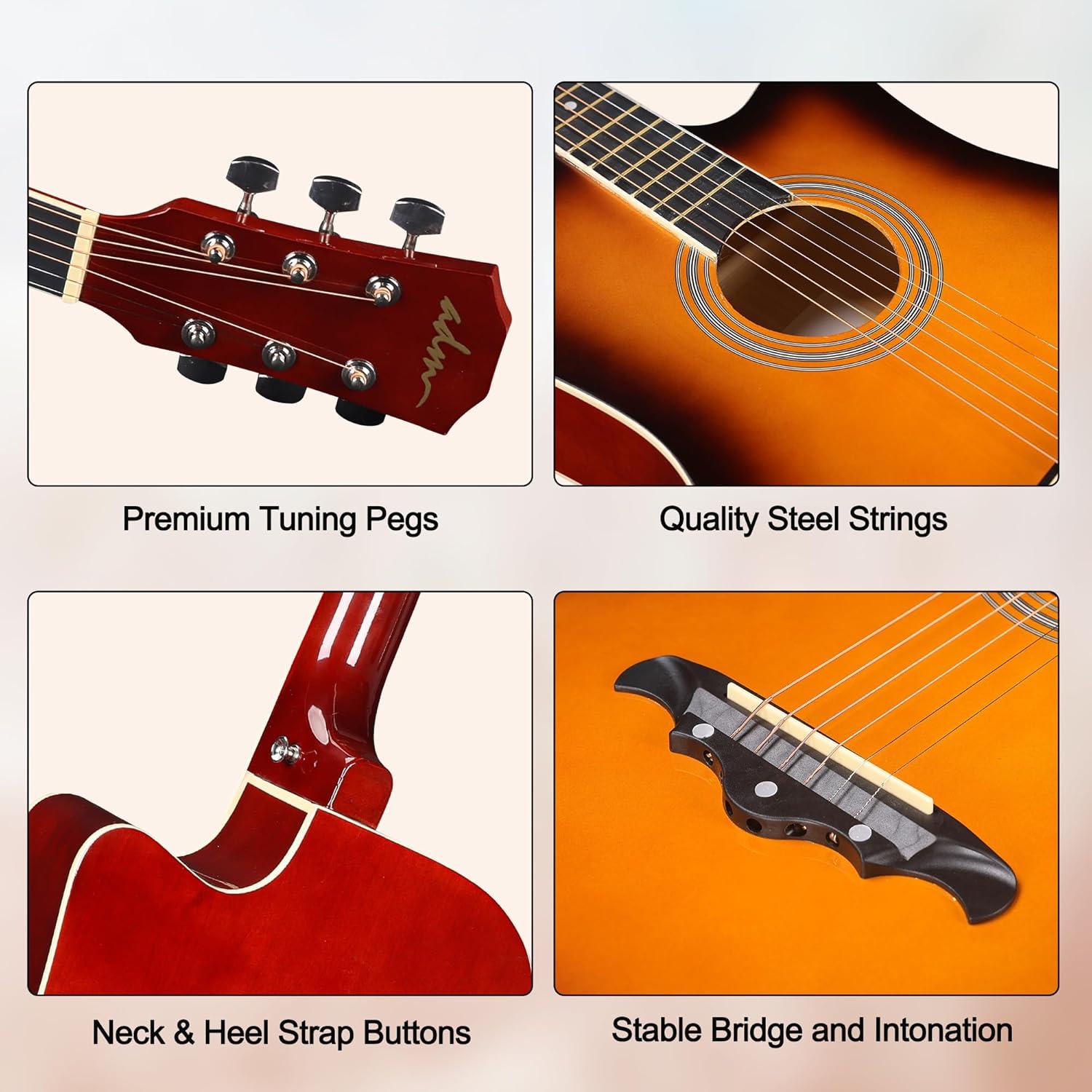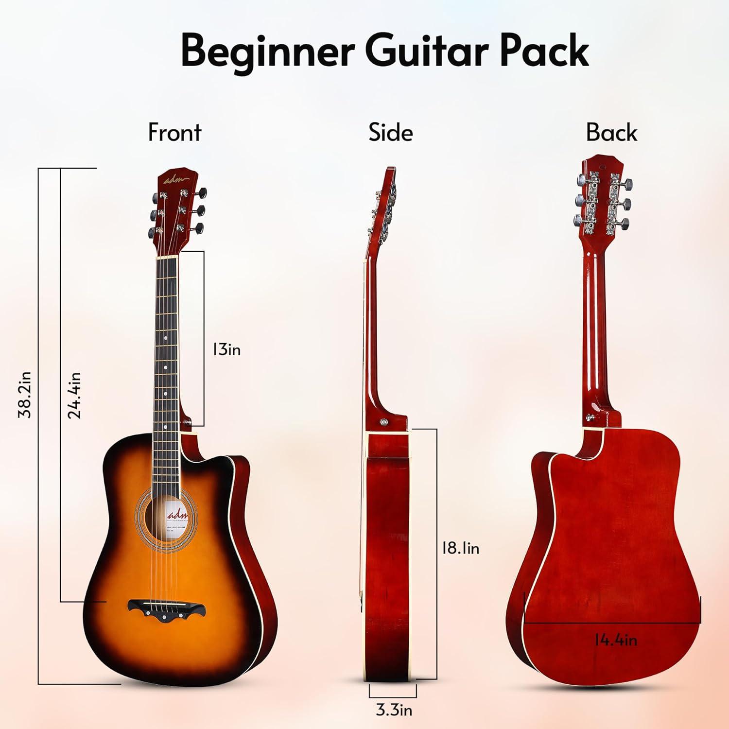 Maximum Playability: ADM 38-inch acoustic guitar with a cutaway body, producing a full and vibrant tone suitable for various musical styles; Its design optimizes playability and tone for beginners, providing a quality instrument that encourages learning and growth