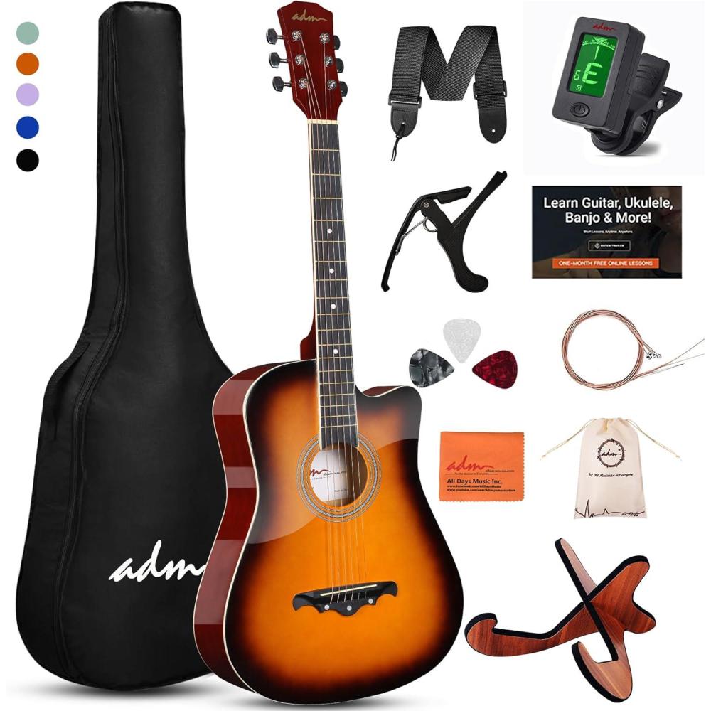 ADM 38″ Inch Acoustic Guitar Bundle for Beginners Adults with Online Lesson, Cutaway Wood Acustica Guitarra Starter Set Package with Gig Bag, Strap, Steel Strings, Picks, Capos, Stand, Green(Sunburst)